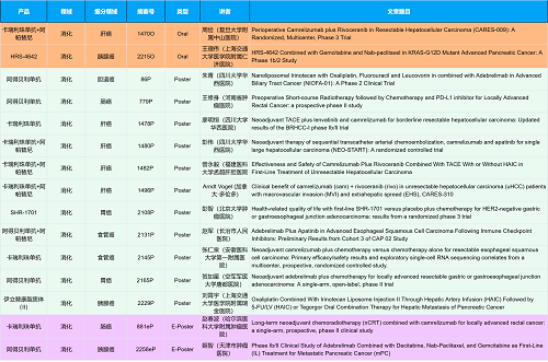 在消化系统肿瘤领域,AG官网创新产品相关研究共入选2项口头报告、10项壁报和2项电子壁报,共14项研究。除了明星药物卡瑞利珠单抗和阿帕替尼外,还有5篇阿得贝利单抗治疗消化系统肿瘤的研究入选。此外,HRS-4642、瑞拉芙普-α注射液(SHR-1701)等未上市创新产品也有相应研究入选。随着新老药物前沿研究的不断推进,有望为消化系统肿瘤患者带来新的福音!