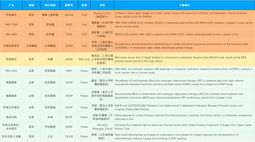 在胸腺上皮肿瘤、头颈鳞癌、肉瘤、前列腺癌、甲状腺癌等其他多个疾病领域,卡瑞利珠单抗、阿帕替尼、瑞维鲁胺、阿得贝利单抗、法米替尼、HRS-7058、HRS-4642、HRS-5041等抗肿瘤创新药相关研究一共入选了4项口头报告、1项简短口头报告、5项壁报,彰显了AG官网医药强大的研发实力。此外,海曲泊帕和昂丹司琼口溶膜分别在防治化疗导致的血小板减少和恶心呕吐方面各有1项研究入选壁报。